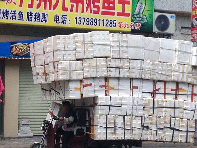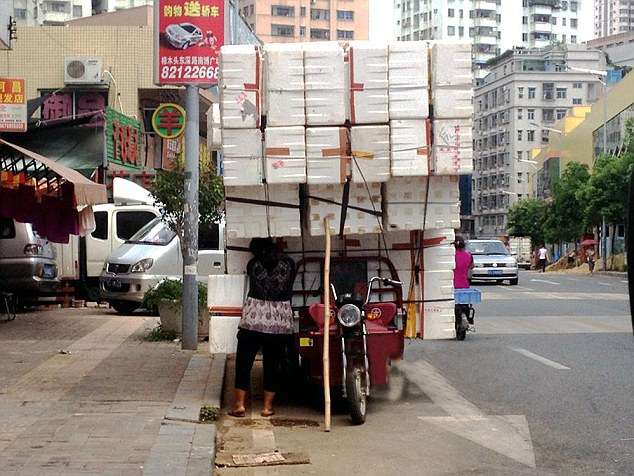 Loading up: The woman was pictured loading the tricycle with box after box in the city of Dongguan